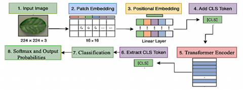 The Figure 3 illustrates a systematic pipeline for implementing the ViT model in the context of coffee leaf disease classification, starting from raw input and ending with class prediction. The process is broken down into the following sequential steps [21]: