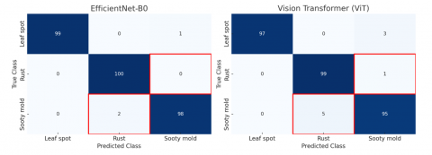 This study presented a comparative evaluation of two state-of-the-art deep learning architectures, EfficientNet-B0 and ViT, for the classification of coffee leaf diseases under natural field conditions. Using a balanced dataset of 843 RGB images, each categorized as Leaf spot, Rust, or Sooty mold, both models were trained and assessed based on classification performance, training dynamics, and feasibility for real-world deployment in agricultural environments.