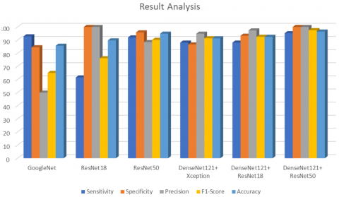 We utilised three hybridisation methods separately: DenseNet121+ResNet50, DenseNet121+Xception and DenseNet121+ResNet18 i.e., illustrated in Figure 1. The rational for using these hybrids is to enable and use more feature extraction and increase its classification capabilities.