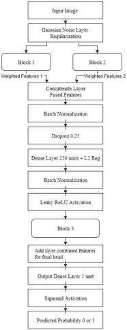 The fusion of DenseNet121 and ResNet50 is achieved by applying Global Average Pooling to the output of each respective encoder block, followed by a direct Concatenation of the resulting feature vectors along the channel dimension. The classification head, which processes this merged feature set, is structured as a three-layer fully connected network (1024, 512, and 256 units). To enhance gradient flow and prevent dead neurons, all intermediate layers utilize the Leaky ReLU activation $(\alpha=0.1)$, followed by batch normalization and successive Dropout layers with rates of 0.5, 0.4, and 0.3. For robust regularization, two techniques are employed: a Gaussian Noise layer $(\sigma=0.01)$ is applied to the input tensor, and an L2 kernel regularizer $\lambda= 10^{-3}$ is applied to the weights of all dense layers within the classification head.