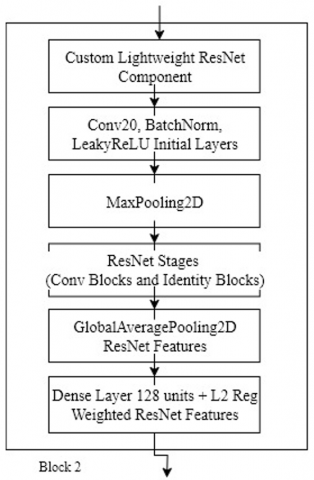 Concurrently, our custom ResNet18 branch, built with carefully designed convolutional and identity blocks, captures more robust, hierarchical features. This bespoke ResNet is optimized to complement DenseNet, focusing on broader spatial patterns while maintaining computational efficiency. The globally pooled features from both the attention-enhanced DenseNet and the custom ResNet are then concatenated, forming a comprehensive, multi-scale representation of the input image. This fused feature vector is subsequently processed by an advanced classification head, featuring multiple dense layers with LeakyReLU activations, batch normalization, and strategic dropout, culminating in a sigmoid output for precise binary classification of sickle cells.