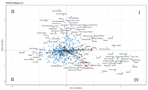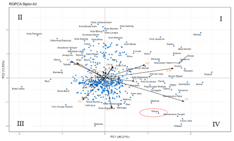 The interpretation of the RGPCA biplot follows the standard geometric principles of PCA-based biplots [22]. The RGPCA biplot divides the districts/cities into four quadrants, which facilitate the interpretation of relative positioning among districts and their association with specific indicators. Districts/cities located in the same direction as an indicator vector are considered to have values above the average. In contrast, those located in the opposite direction of an indicator vector are considered to have values below the average. Meanwhile, districts/cities near the center indicate values close to the average. Based on Figures 5-8, Nduga consistently appears far from the origin (0,0) in the biplot, suggesting that its development profile differs markedly from that of most other districts/cities, which are generally clustered near the center and located in quadrants different from Nduga’s position.