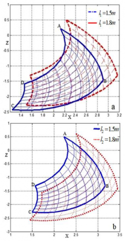 In Figure 4, the lengths of the first section, the second section and the third telescopic section are $l_1=1.8m$, $l_2=1.5m$ and $l_3=2m$, respectively, and $ϕ_2$ changes between 50° and 130°. Figure 4(a), where $30°≤ϕ_1≤70°$ in the solid line and $30°≤ϕ_1≤80°$ in the dotted line, shows that the increase in the upper bound of $ϕ_1$ does not promote the effective motion trajectory of the manipulator. Figure 4(b), where $50°≤ϕ_2≤130°$ in the solid line and $50°≤ϕ_2≤130°$ in the dotted line, shows that the increase in the lower bound of $ϕ_2$ does not promote the effective motion trajectory of the manipulator.
