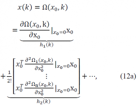 Let $\theta_{1} \subseteq \mathbb{R}^{n}$ and $\theta_{2} \subseteq \mathbb{R}^{n}$ be the subsets of the initial state space and the convergence domains of the Maclaurin series in (12a) and (12b), respectively. Assume that $\Theta=\theta_{1} \cap \theta_{2}$ is not empty and let x(0)= $\varepsilon \mathrm{x}_{0} \in \Theta$ be the initial condition, where $\mathcal{E}$ is an arbitrary parameter. The parameter $\mathcal{E}$ exists since $\Theta$ is assumed to be nonempty. The value of $\mathcal{E}$ does not have any importance and just simplifies the calculations. Therefore, (12a) and (12b) are rewritten with respect to the $\varepsilon \mathrm{x}_{0}$ instead of x0 such that