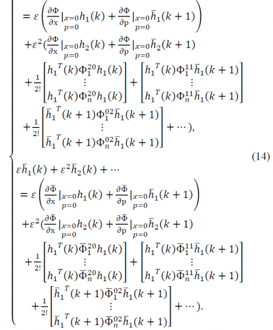 $\left\{\begin{aligned} \mathrm{x}_{\varepsilon}(\mathrm{k}) &=\Omega\left(\varepsilon x_{0}, k\right)=\varepsilon h_{1}(k)+\varepsilon^{2} h_{2}(k)+\\ &=\sum_{i=1}^{\infty} \varepsilon^{i} h_{i}(k) \\ \mathrm{p}_{\varepsilon}(\mathrm{k}+1) &=\overline{\Omega}\left(\varepsilon x_{0}, k+1\right) \\ &=\varepsilon \overline{h}_{1}(k+1)+\varepsilon^{2} \overline{h}_{2}(k+1)+\cdots \\ &=\sum_{i=1}^{\infty} \varepsilon^{i} \overline{h}_{i}(k+1) \end{aligned}\right.$ (13)