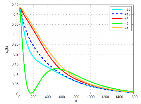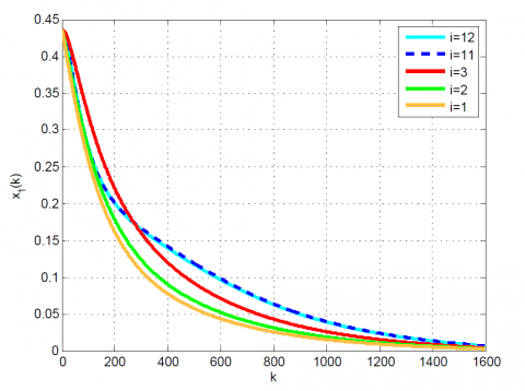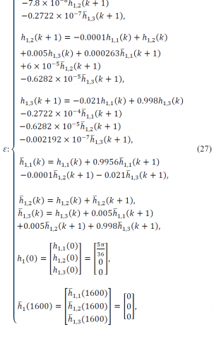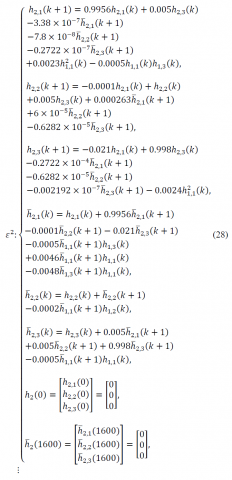 and so on (we continue the process with respect to the order of ε). Notice that, the expressions 15(a) and 15(b) are two systems of homogeneous and non-homogeneous linear time-invariant first-order difference equations, respectively. At the first step, assume that $h_{1}(k)$ and $\overline{h}_{1}(k+1)$ have been obtained from (15a) In the second step, $h_{2}(k)$ and $\overline{h}_{2}(k+1)$ can be obtained simply from 15(b) as the non-homogeneous terms of 15(b) are computed from the solution of (15a) Continuing the mentioned process, $h_{i}(k)$ and $\overline{h}_{i}(k+1)$ for $i \geq 2$ can be obtained easily by solving the non-homogeneous linear time-invariant first-order difference equations in the ith step. Within a recursive procedure, the non-homogeneous terms are calculated by the information of previous steps.