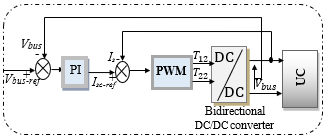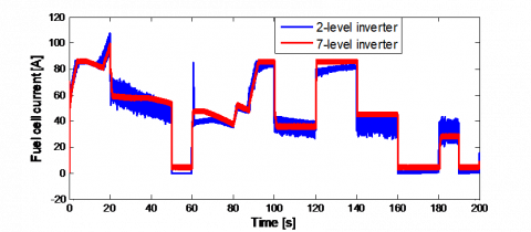 The global system is detailed in Figure 1. It is composed of two sources, the first one is the FC and the second one is the UC that are connected to the DC link bus through a unidirectional DC/DC and current bidirectional DC/DC converters respectively. The FC/UC currents are controlled using PI regulator and the DC link voltage is chosen to be maintained to 500V to supply the traction motor (PMSM) with employing of a seven-level inverter to convert the DC voltage on AC voltage. The energy management of hybrid source based on fuzzy logic is used in the whole vehicle cycle. Simulations are carried out using MATLAB/Simulink environment under various operating conditions to show the effectiveness of proposed methodology. Simulation results reflect the effectiveness of proposed scheme in steady state and dynamic operating conditions.