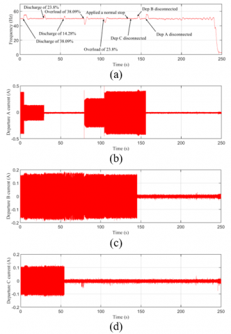 Figure 10. Experimental waveforms with application of different load variations. (a) Frequency waveform versus time, (b) current waveform of the departure A versus time, (c) current waveform of the departure B versus time, (d) current waveform of the departure C versus time