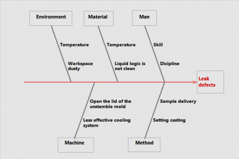 Figure 5, it can be seen that there are 6 types of defects in the process due to casting, with the highest number of defects occurring on leak defects of 34.3%, porosity motive holes of 29.2%, oval defects of 16.8%, the total number of three types of defects to 80.3%. Three types of defects are preferred to improve production quality.
