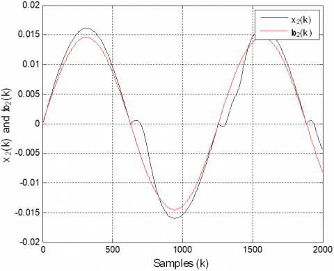 Figure 2. Evolutions of $x_{2}(k)$ (black line) and its estimate $\hat{x}_{2}(k)$ (red line)