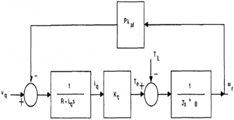 $\frac{\mathrm{w}_{\mathrm{r}}(\mathrm{S})}{\mathrm{V}_{\mathrm{q}}(\mathrm{S})}=\frac{\mathrm{K}_{\mathrm{t}}}{\left(\mathrm{R}+\mathrm{L}_{\mathrm{q}} \mathrm{S}\right)(\mathrm{JS}+\mathrm{B})+\mathrm{K}_{\mathrm{t}} \mathrm{P} \lambda_{\mathrm{af}}}$ (20)