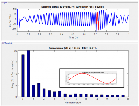 It is seen that in this case THD is reduced to some point and to reduce THD, we use power electronics load and PI controller. THD is seen for a particular time period of 0.7-0.9 seconds.