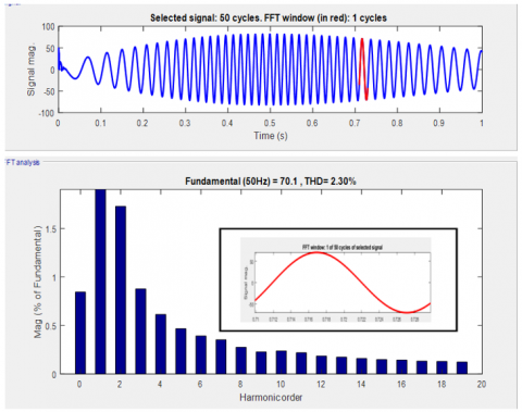 Figure 20 represents the total harmonic distortion when PI controller and STATCOM are not active and the FFT window of voltage total harmonic distortion.