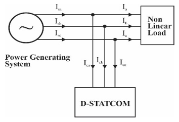D-STATCOM is shunt connection VAR power compensating apparatus. It has the capacity to generate the reactive power as well as absorb the reactive power in variable output condition to manage the electrical power system parameters as exact. Generally, it is a solid state controlled converter. Separately, it has the capability to generate or absorb controllable true or VAR power at the terminal of the output when it is supplied from the energy storing device at terminal of the input [17]. To supply a dc voltage, the energy storage capacitor is employed.