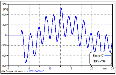 Although the transient overvoltage across the CB and (SR) is reduced by controlled switching, the recovery voltage remains high. Therefore, in order to avoid undesirable conditions affecting system operation that could be caused by changes in system parameters such as stray reactor capacitance, circuit modifications are required to avoid the creation of a large TRV across the CB. Figure 15 shows the TRV value across the CB contacts.