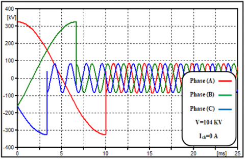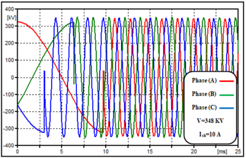 Grounding (SR) through neutral reactors helps prevent secondary arcs. The size of the neutral reactor is selected according to system requirements, and manufacturers offer custom options based on size specifications. The equation for grounded neutral reactors mainly affects the first pole-to-clear. In such cases, there's minimal or no neutral shift. When considering the second and third pole-to-clear, the release of inductive energy during current chopping decreases. This means that chopping overvoltage is generally lower for the second and third poles unless the chopping current level is significantly higher than that of the first pole [3]. In practical field experiments conducted on 400 kV switchyards with similar reactors and circuit breakers, chopping current values typically ranged from 2 to 14 A [4, 17]. Following a current interruption, a (TRV) would be generated across the CB contacts. If damping is ignored, its maximum predicted value is equal to the sum of the source's peak voltages and the overvoltage caused by current chopping. TRV, calculated using analytical or simulation methods, represents the voltage surge after current interruption. Higher TRV stresses circuit breaker insulation and current interruption capability. Optimizing these aspects based on accurate TRV calculations ensures reliable circuit breaker performance and system protection. Figure 5. explain principles of current interruption and associated effect.