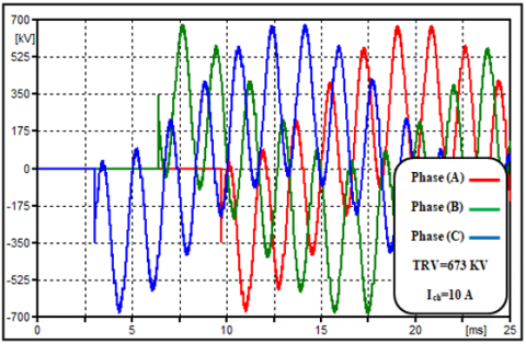 Re-ignition is the reappearance of current through an arc that has been extinguished. This can happen during the de-energization of a shunt reactor when the circuit breaker is opened to disconnect the reactor from the power system [2, 19]. The circuit breaker (CB) is essential for disconnecting current and ensuring it drops to zero. The gap distance between circuit breaker contacts plays a crucial role in arc extinction and, consequently, in the occurrence of re-ignition. A larger gap generally facilitates more effective current interruption by providing ample space for energy dissipation within the arc channel. This effectively reduces the chances of the arc reigniting after its initial extinction. Conversely, a smaller gap can increase the risk of re-ignition, particularly under high Transient Recovery Voltage (TRV) conditions, Figure 6. Shows TRV due to current interruption. TRV, closely linked to arc extinction dynamics, represents the voltage appearing across the breaker contacts after current interruption. If this voltage exceeds the dielectric strength of the gap medium (air or vacuum), it can trigger re-initiation of the arc [5]. Re-ignition occurs when the arcing time is short and contact gaps cannot withstand voltage stress. When inductive current is interrupted, re-ignition occurs, causing stress on the circuit breaker (CB). Load voltage is conveyed back to the power source as a high-frequency oscillation, causing overvoltage [16]. Optimizing circuit breaker design involves considerations of factors like arcing time and Transient Recovery Voltage (TRV) to minimize the risk of re-ignition. Advanced techniques and materials can reduce arcing time, the duration between contact separation and arc extinction. By controlling TRV and minimizing arcing time through design optimization, the probability of re-ignition is diminished, enhancing interruption performance and system reliability [20]. Advances in circuit breaker technologies, including SF6, vacuum, and others, further contribute to minimizing re-ignition, thereby improving overall performance in medium voltage applications.