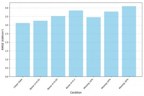 Data Incompleteness: To simulate lacking statistics, random portions (10%, 20%, 30%) of the input capabilities had been removed and imputed the usage of linear interpolation. While RMSE increased with higher lacking prices, the model proved resilience, with an RMSE of 3.45 kWh/m² for 10% lacking statistics and 4.10 kWh/m² for 30% missing records.