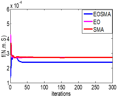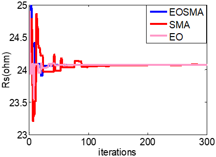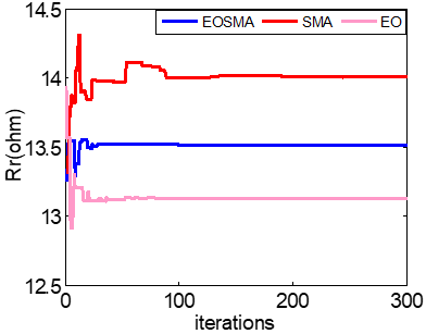 Figures 5-11 show the changes in IM parameters as a function of iterations. EOSMA, EO, and SMA search for IM parameters in the research space indicated in Table 4. At the beginning of the iteration, the algorithms provide random parameters, and the error rate of the parameters is large. After 80 iterations, the parameters begin to converge to the correct results. After the research is completed. We conclude that algorithm EOSMA obtained better and more accurate results because the objective function EOSMA is minimized (objective function EOSMA: 0.8).