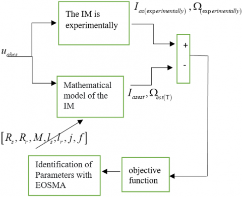 The Figure 2 shows the process of identifying IM parameters. The procedure begins with the experimental testing of the IM, where stator currents and speed are measured. Next, a mathematical model of the IM is developed to simulate its behavior based on the given input parameters. The experimental and simulated data are then compared, and the difference between the two is calculated. To minimize this discrepancy, the EOSMA algorithm is applied for parameter identification, optimizing the IM parameters to improve accuracy. Finally, an objective function is used to evaluate the precision of the model by assessing the computed errors. This systematic approach ensures a reliable and accurate identification of the IM parameters.
