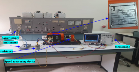 Figure 3 illustrates the experimental setup used to extract current and speed data from a no-load IM. The IM was powered by a stable three-phase 380 V supply and operated under no-load conditions. The experiments were conducted in a laboratory environment at a constant ambient temperature of approximately 28°C. Voltage stability was maintained throughout the tests using a regulated power source. The current was measured using a cathode-ray oscilloscope connected in series with a 1-ohm resistor, while motor speed was measured using both a tachometer and the oscilloscope. The acquired current and speed signals were transferred to a computer in Excel format for further processing and analysis in MATLAB. The experimental data obtained from this setup was matched with the mathematical model to accurately estimate the parameters of the IM.