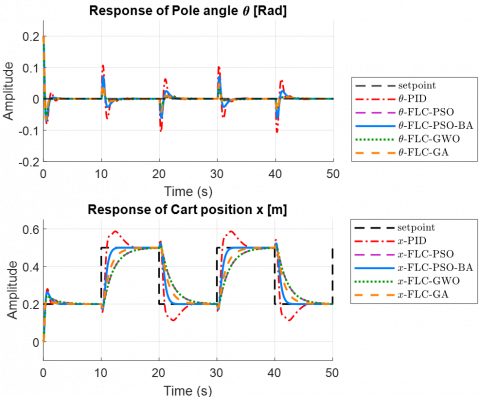 In this section, MATLAB/Simulink-based simulations are conducted to validate the theoretical foundation and evaluate the practical applicability of the proposed optimization approach. The performance is also compared with that of conventional PID controllers [11], fuzzy controllers optimized using standard PSO, fuzzy controllers tuned via Genetic Algorithm (GA) [19], and those optimized using the Grey Wolf Optimizer (GWO) [26]. In the standard PSO, GWO, and GA, the initial population is randomly generated within the defined bounds of the solution space. Simulation parameters are detailed in Tables 1 and 2. All fuzzy controllers applied to the inverted pendulum system share the same structural design, including identical membership functions and fuzzy rule bases [19].