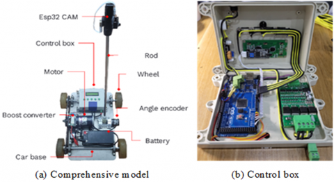 To experimentally validate the theoretical findings and simulation results presented in Section 4.1, a physical prototype of a system consisting of an inverted pendulum and a cart was constructed. Notably, this practical model incorporates an ESP32 camera as the pendulum mass (m), thereby demonstrating the feasibility of developing an autonomous vehicle equipped with an inverted pendulum for real-time target surveillance applications in both civilian and military contexts. To achieve this, the software component integrates the YOLO v3 algorithm for efficient image data processing from the camera. In the practical implementation, a TPS61088 boost converter elevates the input voltage to 24VDC to drive the motor, while an angular sensor precisely measures the angular displacement (θ) of the pendulum, consistent with the theoretical framework outlined in previous sections. Figure 14 illustrates the actual system diagram of the cart-inverted pendulum setup, including the control box design. From a software perspective, in addition to YOLO v3 for image processing, the system utilizes a WinForms interface to provide real-time monitoring and visualization of critical parameters, such as the pendulum's angular deviation, motor control signals, and live video feed from the ESP32 camera, enabling users to effectively observe the surrounding environment. A significant advancement of this physical model, beyond maintaining the pendulum rod in the upright (zero angular deviation) position, lies in its capability to stabilize the rod at any arbitrary angle. Figure 15 demonstrates this capability, showcasing the pendulum rod positioned at a 133° angle with the corresponding pulse-width modulation (PWM) signal applied to the motor. The experimental results unequivocally demonstrate the system's exceptional control performance, successfully achieving the desired objective of balancing the inverted pendulum rod while simultaneously facilitating target tracking through the integrated camera and robust image processing software.
