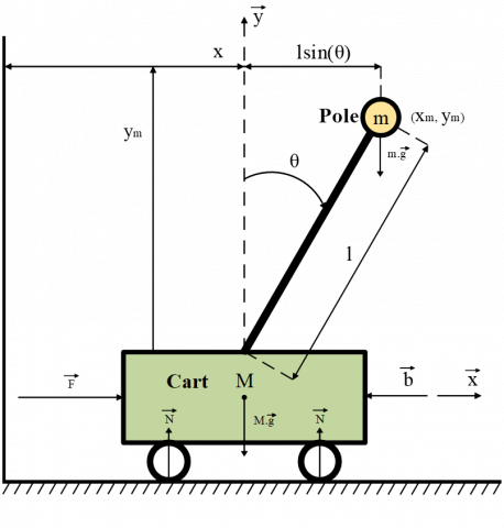 The force, denoted as F, represents the control action exerted on the cart by its onboard electric motor. This force serves as the manipulative input variable, denoted interchangeably as F or u, aimed at achieving stabilization of the pendulum at its unstable upright equilibrium. Utilizing the system’s equations of motion, presented as Eqs. (1) and (2), the following dynamic relationships can be derived: