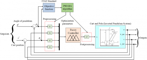 This approach addresses some of the limitations of PSO while combining the strengths of both algorithms. The organization of this paper is structured into five Sections. Following the Introduction, Section 2 discusses the mathematical modeling of the cart-inverted pendulum system and the framework of the control strategy utilizing a fuzzy logic controller. Then, Section 3 introduces an enhanced PSO algorithm integrated with the BA algorithm. Section 4 highlights the simulation outcomes carried out on MATLAB/Simulink software as well as the practical experiments on a physical prototype, and the final section concludes the study while suggesting potential future research directions.