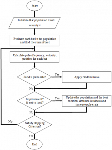 This algorithm flexibly combines exploration—broadly searching the entire space to avoid being trapped in local optima and exploitation refining potential solutions around the optimal region. The balance between these two phases is controlled through parameters such as frequency, pulse emission rate, and loudness. The search process continues until one of the stopping criteria is satisfied, such as reaching the maximum number of iterations, achieving population convergence, or observing no significant improvement in the objective function value.