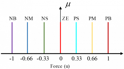 For the fuzzy logic controller, four input variables are defined: the pendulum angle relative to the equilibrium position, the pendulum's angular velocity, the cart position, and the cart velocity. The output variable of the system is the force applied to the cart. Three fuzzy sets are defined for each input variable, and the number of fuzzy sets for the output variable is chosen as 7. Thus, the direct fuzzy logic controller has 81 fuzzy rule sets [19]. The applicability of this fuzzy logic controller will be tested in Section 4.
