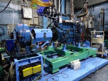 The experimental investigations were conducted on a six-cylinder, water-cooled, spark-ignition (SI) multi-cylinder engine designed for CNG fueling. The engine specifications are provided in Table 2. A full-load control eddy current dynamometer (SAJ AG 150) was used to apply load and maintain constant engine speed during testing. The actual experimental test setup is shown in Figure 1.