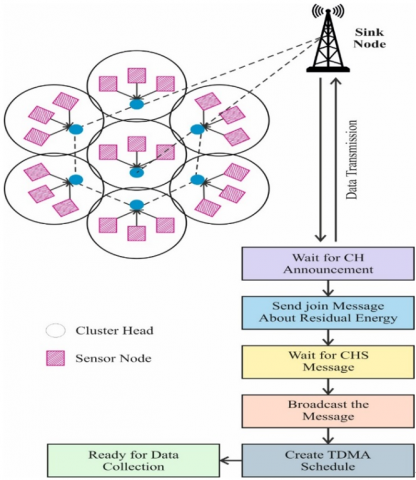 where, D_t0 CH(j) represents the distance among CM(i) and its candidate (CH)_j, and k represents the number of CHs. Additionally, ND(CH_j) represents CM(i)'s candidate's node degree. First, the final picked CH broadcasts its ID and node degree inside its communication range. The node degree is unitless, but it is being multiplied by a cost term with energy units (e.g., Joules/bit). Each CM estimates cost. The CM will proclaim itself as a CH when k=0, meaning no CH message is received. Therefore, optimum clusters are constructed with higher-cost CHs and CMs. Data transfer after cluster formation is particularly important for WSN energy saving since inappropriate transmission causes failure or collision. Transmission from CMs to CHs using time division multiple access (TDMA) improves these issues.