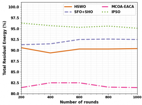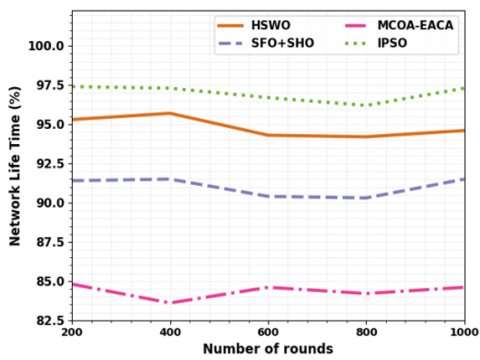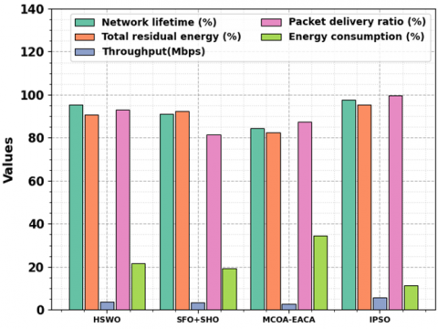The values in Table 6 used in Figure 7 HSWO follows with a steady performance between 94% and 96%, while SFO+SHO maintains around 90%, reflecting moderate efficiency for scenario-1. In contrast, MCOA-EACA shows the lowest performance, with network lifetime ranging between 83% and 85%, suggesting poor energy management.