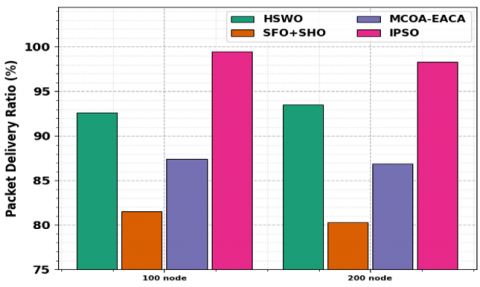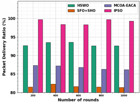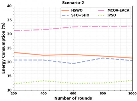 In Figure 8, based on the values in Table 7 show the comparison of energy consumption across multiple rounds reveals that the IPSO algorithm achieves the lowest consumption, maintaining values around 12% to 14%, indicating exceptional energy efficiency. HSWO and SFO+SHO exhibit moderate energy usage, averaging between 21% and 24%, with minor fluctuations across rounds. In contrast, MCOA-EACA consistently consumes the most energy, with values ranging from 30% to 33%, suggesting inefficient resource utilization for scenario-2.