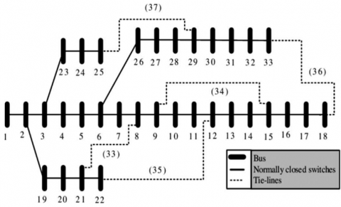The IEEE 33-node system [21] consists of 33 node and 37 branches in Figure 2, with five normally open tie switches (branches 33–37). Under normal operation, the system operates in radial mode, and switches {33, 34, 35, 36, 37} are initially open.