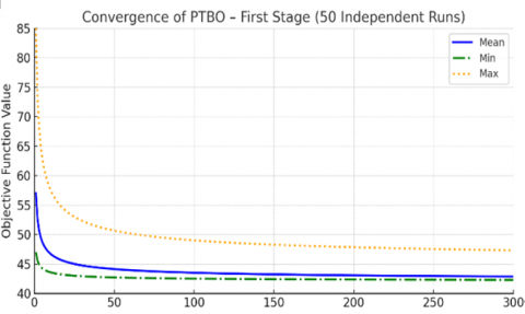 Figures 3 and 4 presents the running results of the algorithm PTBO exhibits rapid and robust convergence in both optimization phases. During the first stage (DG placement), the average objective function value plunges dramatically within the first 20–30 iterations—from approximately 57 to below 45—and settles into a stable range of 43–46 by the 100th iteration. Moreover, the spread between the minimum and maximum values contracts to less than 2 units, underscoring the algorithm’s high reproducibility across 50 independent trials. In the second stage (network reconfiguration), although the initial objective starts at a higher level (~75), PTBO still swiftly descends to around 60 within 20–30 iterations and ultimately converges around 54–57. Here, the final difference between Min and Max falls under 8 units, evidencing sustained performance and dependability on the more complex reconfiguration task. Collectively, these convergence behaviors confirm that PTBO strikes an excellent balance between convergence speed and solution stability, rendering it highly effective for power loss minimization and DNR in modern power systems.