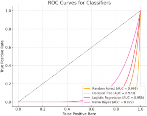 To further assess classifier discrimination ability, we plotted ROC curves for each model. The Area Under the Curve (AUC) measures how well the classifier separates the positive and negative classes. Higher AUC indicates better performance across all classification thresholds. In addition, we used Matthews Correlation Coefficient (MCC), which provides a more balanced evaluation in the presence of class imbalance. MCC takes into account all four confusion matrix categories and is widely used for IDS evaluation.