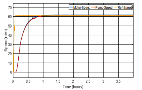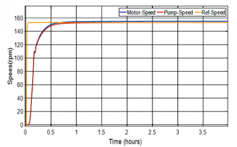 The graph reveals that the system exhibits excellent dynamic performance. When the reference speed changes, the motor and pump speed quickly respond and track the reference accurately. The transient response is characterized by minimal overshoot and settling time, indicating effective control and minimal energy losses.