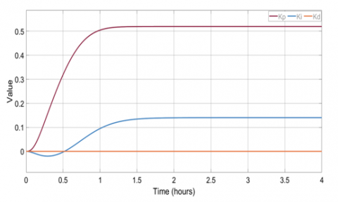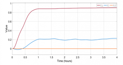 Figure 18 shows the adaptive PID controller response. In contrast to the first scenario, the Ki value exhibits different behavior. It rises initially, then fluctuates slightly before leveling off at a constant value. It’s a rhythmic activity in Ki may suggest that low irradiance conditions cause more disruptions or fluctuations in the system. The controller modifies the integral gain to account for these disruptions and preserve precise control.