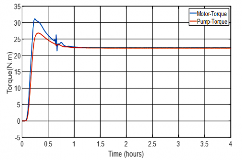 The startup transient, during which the motor accelerates to its operational speed, is represented by the first peak in both the motor and pump torque. The torque stabilizes constantly when the motor approaches a steady state. The motor torque is quickly adjusted to accommodate any subsequent changes in the load torque, such as water flow or pressure variations.