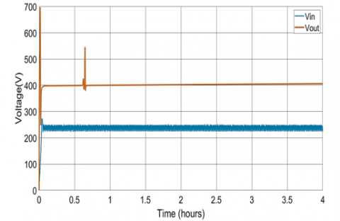 The SEPIC converter keeps the output voltage at 400V with little ripple when the input voltage stabilizes. This demonstrates the converter's accuracy and effectiveness. The performance and efficiency of the entire system depend on the converter's capacity to manage changing input conditions while maintaining a steady output voltage.