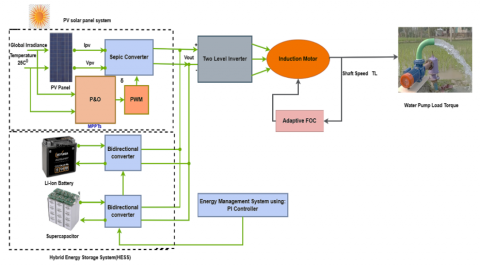 The battery and supercapacitor that make up the HESS are connected by a bidirectional DC-DC converter. While the supercapacitor offers greater power density and quick charge-discharge capabilities, the battery maintains energy for a long time. A proportional-integral (PI) controller adjusts the power flow between the battery and supercapacitor to maximize energy efficiency and system stability [9]. The centrifugal pump is powered by a FOC induction motor. FOC is an advanced control method [10] that makes it possible to precisely regulate the motor torque and speed. In daily life, the majority of us currently utilizing renewable energy by modifying the stator flux and torque components independently, FOC enhances dynamic performance and efficiency. FOC based on conventional PID speed controllers have troubles like high overshoot try and error tuning, so it is necessary to convert to another type that adaptivity tuning parameters to handle different scenarios [11]. Under different levels of solar radiation, the adaptive speed controller maximizes the system's performance. By adjusting the reference speed of the induction motor based on the amount of solar power available, the controller maximizes water extraction and ensures cost-effective energy use. This paper examines the use of an adaptive speed controller for a field-oriented controller (FOC) induction motor powered by a HESS. A large number of simulations and tested and conducted in different operational contexts.