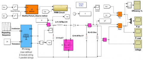 The calculated average MPPT efficiencies for the classical P&O, INC, and improved P&O algorithms are 94.50%, 97.837%, and 98.1 7%, respectively. Table 4 compares the MPPT tests with the algorithms proposed in this study. The fully proposed simulink model was built in MATLAB SIMULINK as can be seen in Figure 11.
