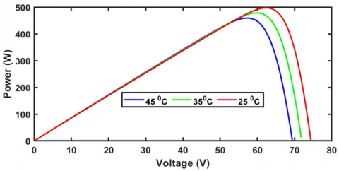 The non-linear characteristics of the outcome of the solar cell in terms of current vs voltage and power vs voltage curve with the intensity of sunlight, which have been tested at constant temperature 25℃ and intensity of $\left(1 \mathrm{KW} / \mathrm{m}^2, 0.5 \mathrm{KW} / \mathrm{m}^2\right.$, and $\left.0.1 \mathrm{KW} / \mathrm{m}^2\right)$, are depicted in Figure 2. On the other hand, the non-linear characteristics of the outcome of the solar cell in terms of ($\mathrm{I}-\mathrm{V}$) and ($\mathrm{P}-\mathrm{V}$) with the intensity of $\left(1 \mathrm{KW} / \mathrm{m}^2\right)$ at the cell temperature have been tested in steps (45℃, 35℃ and 25℃), are depicted in Figure 3. In cases where these two factors change, the MPP also changes. Therefore, voltage and current must be controlled to achieve the optimal power operating point. Table 1 presents the properties of the PV arrays (two module strings) at MPP under various temperature and solar irradiation examples.