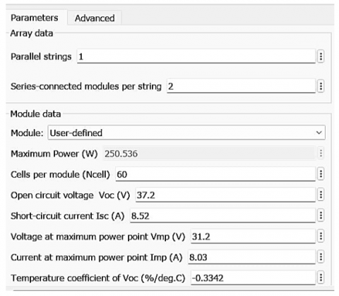 Figure 8. Solar module parameters $\left(G_{S T C}=1000 \mathrm{~W} / \mathrm{m}^2\right)$
