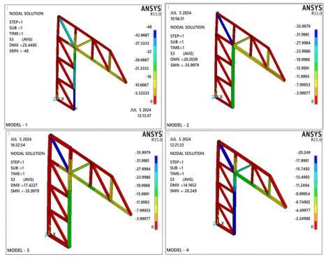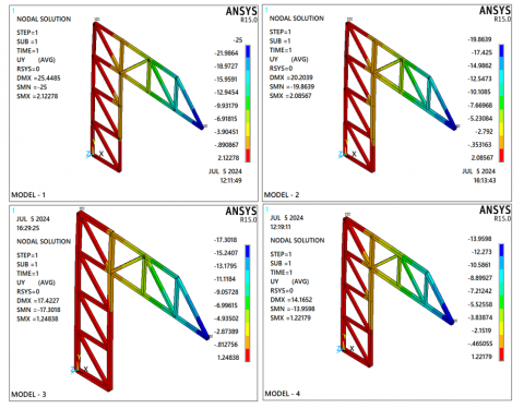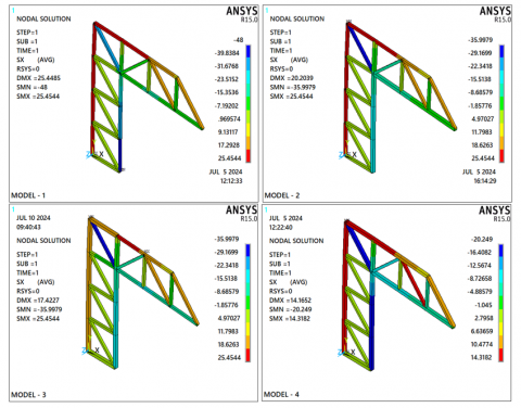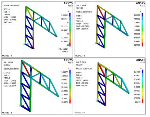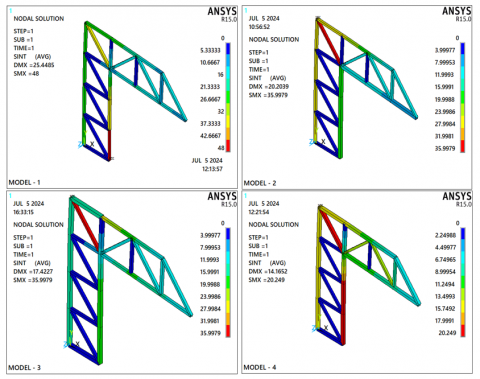 The most significant findings can be obtained by analyzing and assessing the data from the ANSYS and Excel programs. In each model, some structural components had a different cross-sectional area, with the exception of the first model, which had equal cross-sectional areas in every part of the structure. These results are as follows: