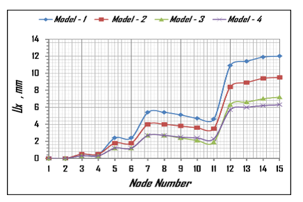 Figure 12. Relation between X - component of displacement $\left(U_x\right)$ and node number of all models