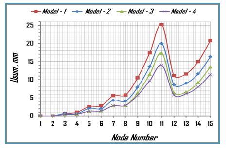 Figure 14. Relation between displacement vector sum $\left(U_{\text {sum}}\right)$ and node number of all models