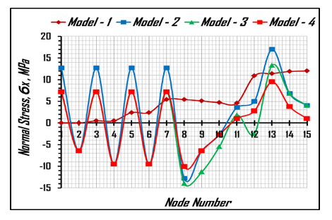 Figure 15. Relation between normal stress $\left(\sigma_x\right)$ and node number of all models